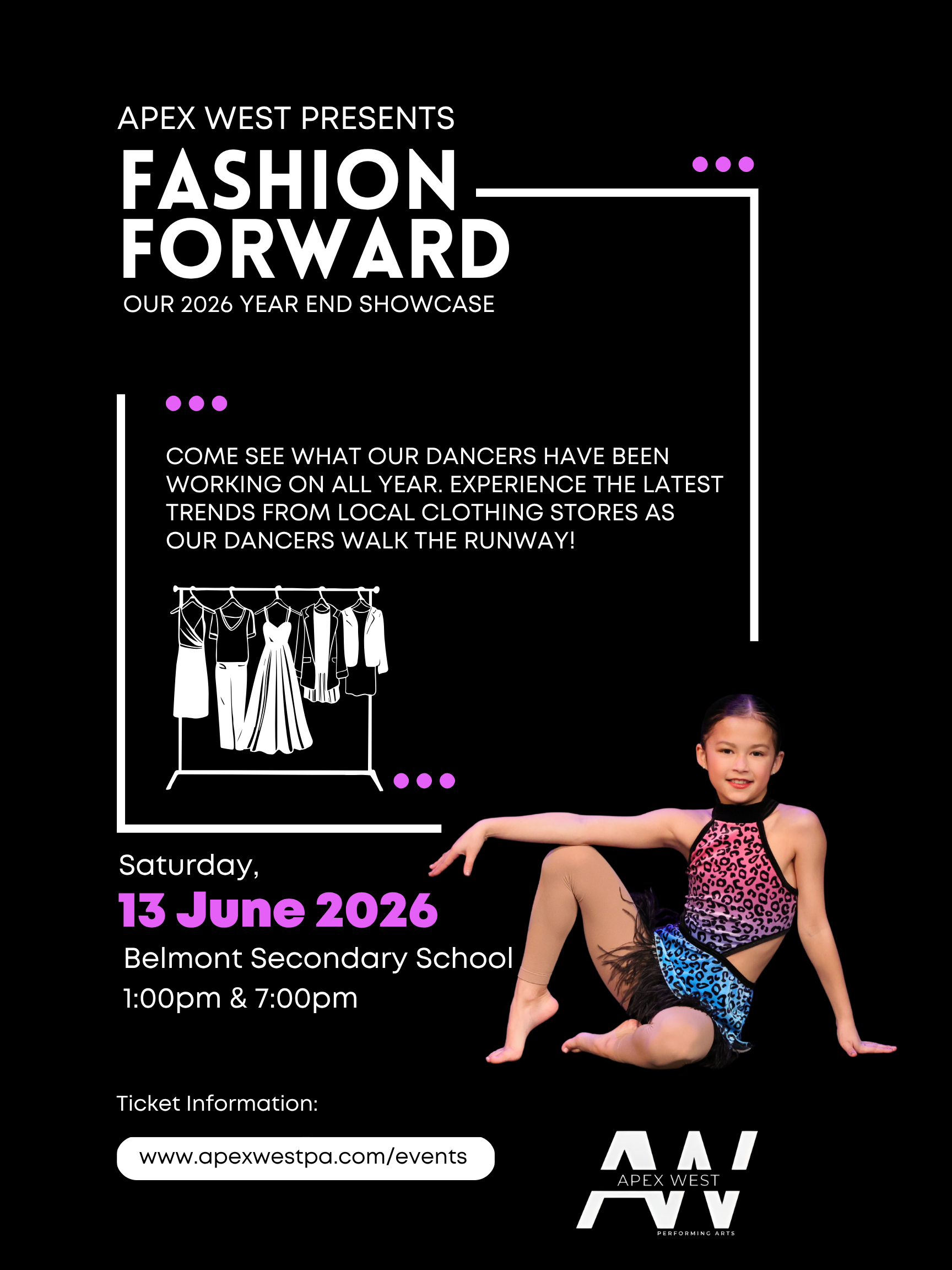 Apex West Performing Arts presents FASHION FORWARD - our 2026 year end Showcase! Come see what our dancers have been working on throughout the year. We also have an exciting opportunity for our dancers to walk the runway!